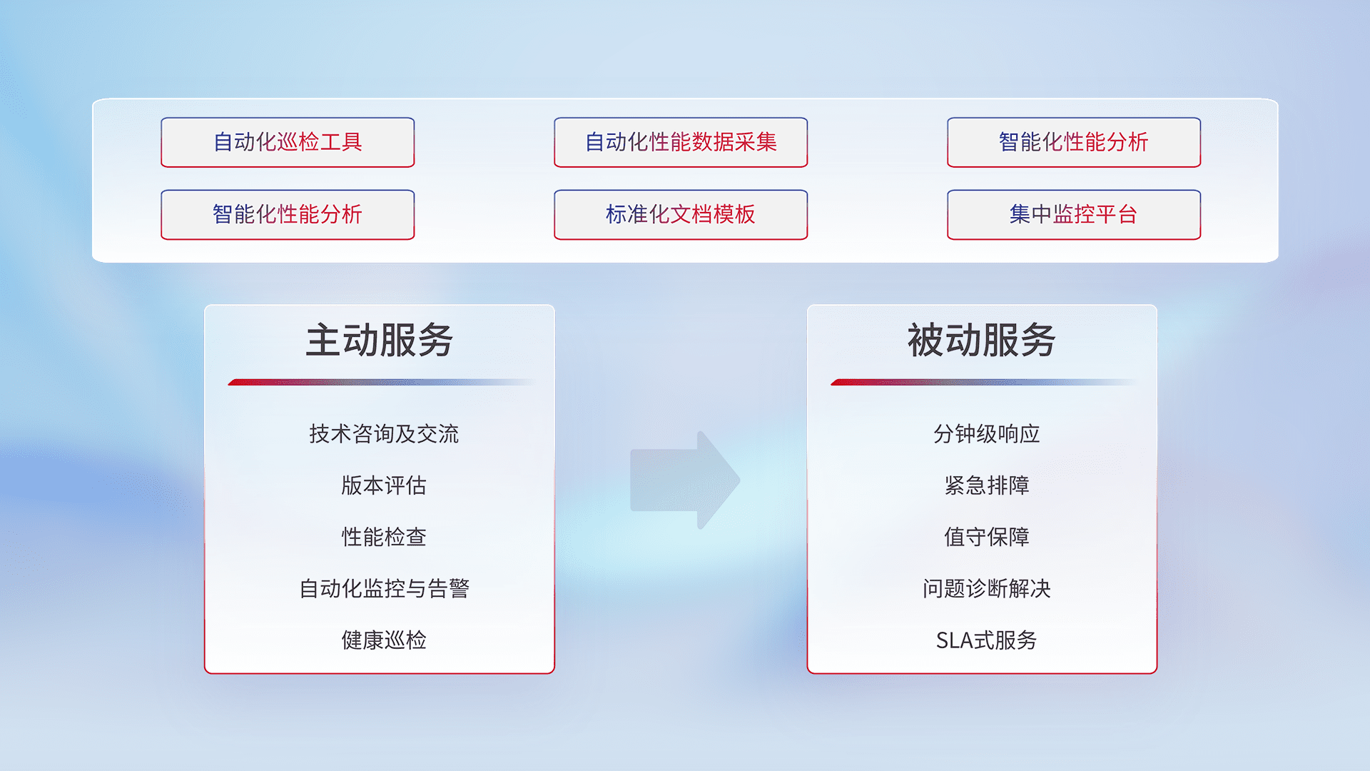 智能化工具和标准化文档,,保障服务质量,,,,提供主动服务(包含技术咨询、、、版本评估、、、、性能检查、、、自动化监控与告警、、、、健康巡检)和被动服务包含(分钟级响应、、、、紧急排障、、、值守保障、、、、问题诊断解决、、SLA服务)。。